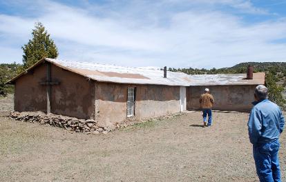 | Hermano Jose Sisneros and Hermano Mayor Edward Vigil walking towards the Morada de San Jose |