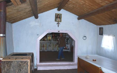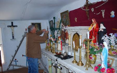| Hermano Jose Sisneros lights candles on the morada altar. Hermano Mayor Edward Vigil invited those of us touring the morada to join him and Hermano Jose to kneel and join him in prayer before we left the morada |