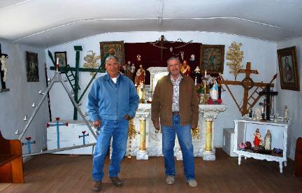 | Hermano Mayor Edward Vigil, on the left, and Hermano Jose Sisneros stand before the altar adorned with symbolic Calvarios (Arma Christis) a candleabraum, and several santos |