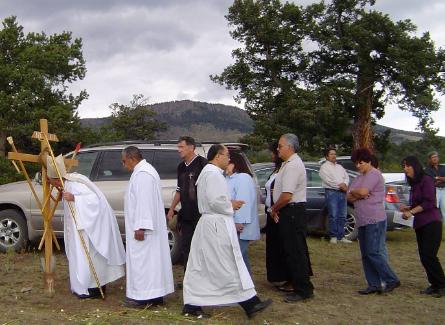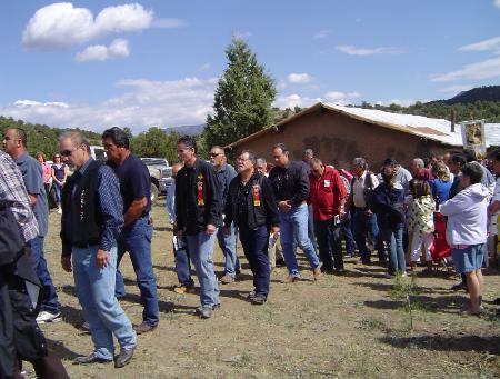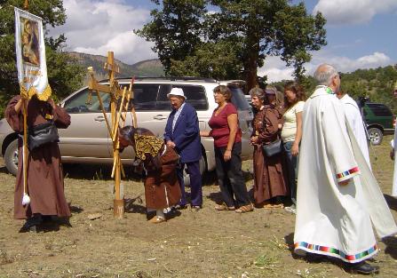 | The Morada de San Jose is located in the village of Agua Ramon near South Fork, Colorado. Although the number of men belonging to the morada (the Hermanos) and the women's auxiliary (the Paduanas) continues to decline, the membership makes up for it in spirit. The morada is neatly maintained and during the month of September the Penitente community celebrates the Day of our Lady of Sorrows which has been attended by the Diocese of Pueblo, CO, Bishop Arthur Tafoya. Priests, Deacons, and Hermanos from the moradas in southern Colorado and northern New Mexico join worshipers and curious onlookers alike for the procession and fine meals supplied and served by attendees. My wife, Joan, and I were invited to meet with the Hermanos and to visit their morada by Alfred Medina, a local supporter of the morada and the Hemanos. Hermano Mayor, Edward Vigil and Hermano Jose Sisneros gave us a tour of the Agua Ramon church, La Mision de San Jose, the Morada de San Jose, and the cemetery which was close by. After eating lunch with the Hermanos we bid them farewell, a fitting end to a memorable day with the Hermandad and other new-found friends. Many thanks to Larry and Libby Ruybal from Pueblo, CO, for their photos of the procession and gathering during the celebration of Our Lady of Sorrows. |