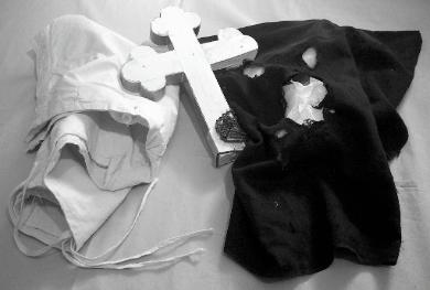 | White pants, black hood and cross used by the Hermanos (Brothers) during Holy week at the Moradas. |