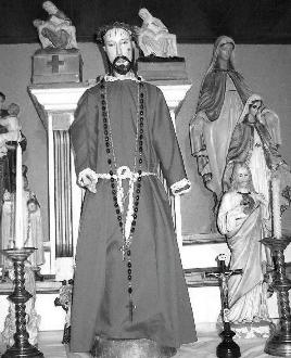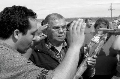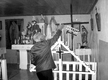 | Father Benito blessing the Crucifix which was sculpted and donated to the San Antonio Morada by Ruben Archuleta. Hermano Mayor (Elder Brother), Charlie Martinez, is holding the crucifix. |