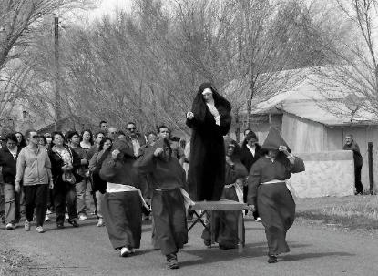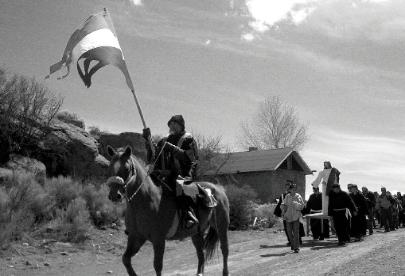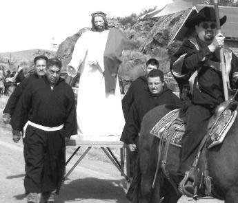 | El Encuentro (the procession) takes place on Good Friday. Here the Hermanos from the San Antonio, CO, morada carry the life-size statue of Jesus to El Calvario (Mt. Calvary) as they pray and sing alabados (hymns) |