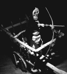 | La Carreta de la Muerte (Death Cart) ridden by Dona Sebastiana may be seen in the moradas throughout southern Colorado and northern New Mexico. This large carreta was created by Ruben Archuleta |