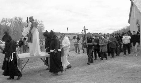 | The Veronicas carrying the statue of Mary are followed by Father Benito and community participants as they sing their hymns and join in prayer. They will meet with the Hermanos at El Calavario, pray together and then work their way back to the morada to conclude their Good Friday services. |