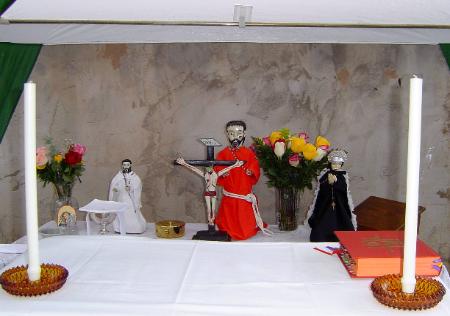 | Hermano Jose Sisneros lights candles on the morada altar. Hermano Mayor Edward Vigil invited those of us touring the morada to join him and Hermano Jose to kneel and join him in prayer before we left the morada |